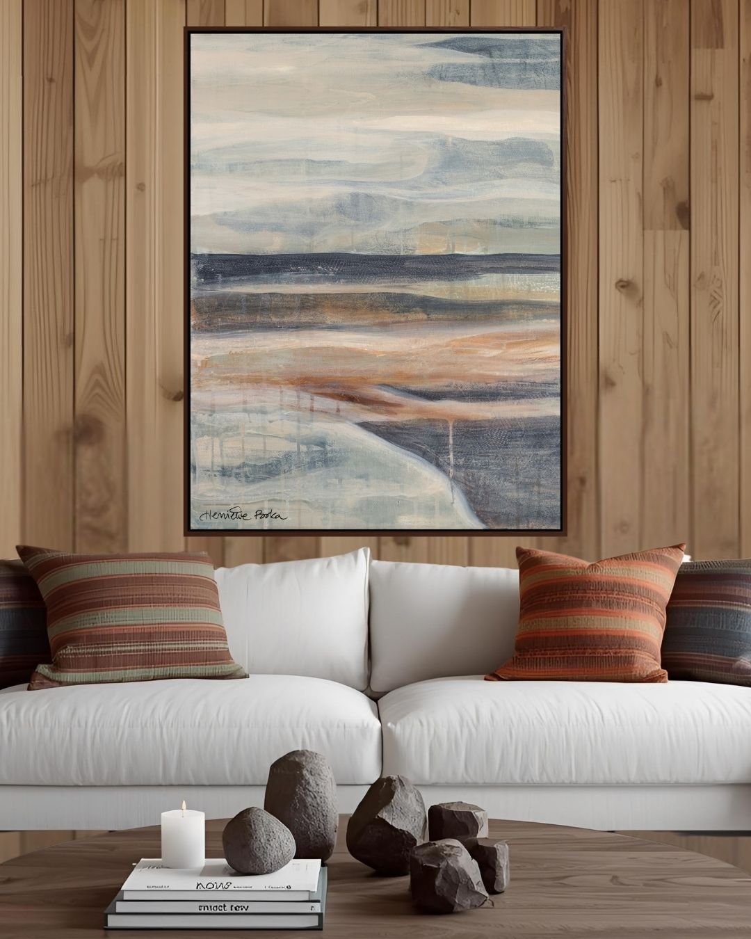 Blissful Morning av Henriette Roka gir deg følelsen av en stille morgen i fjellheimen. Maleriet har lyse, kjølige toner med subtile kontraster som passer perfekt til lys nordisk stil. Motivet er trykket på canvas og rammet inn med brun svevelist i tre.