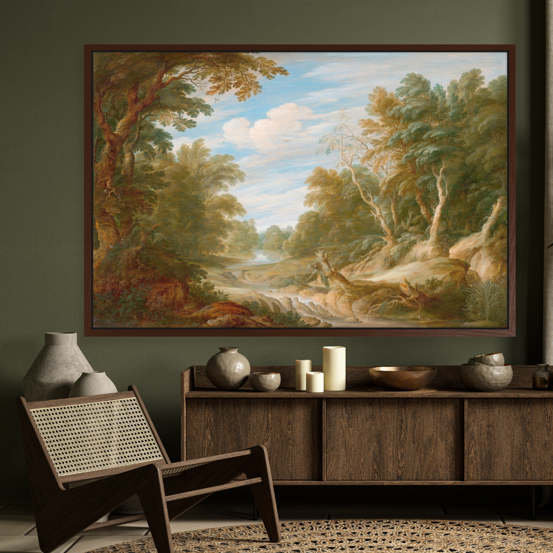 De frodige grønntonene, den klare himmelen og den myke elven gir rommet en friskhet og dybde som føles både luksuriøs og organisk. Dette kunsttrykket er et ideelt valg for deg som ønsker å integrere botaniske trender, naturmaterialer og grønne detaljer i interiøret.