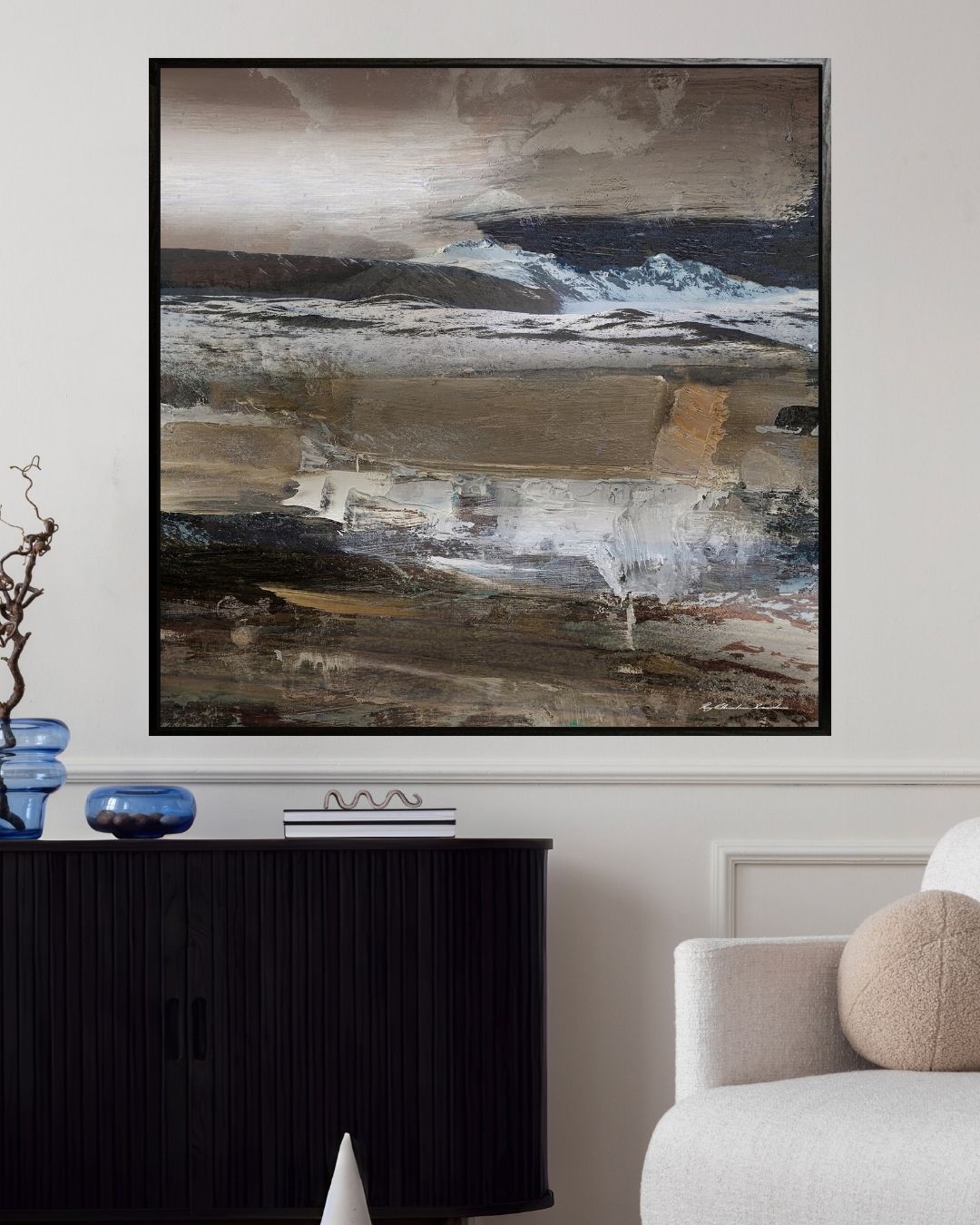 "Blåne"av Roy Chr Lauritsen er et kunstverk som fanger fjellenes mystikk med mørke toner og strukturerte penselstrøk. Perfekt for deg som ønsker et kraftfullt og tidløst uttrykk i interiøret. Motivet er trykket på canvas og rammet inn med sort svevelist i tre.